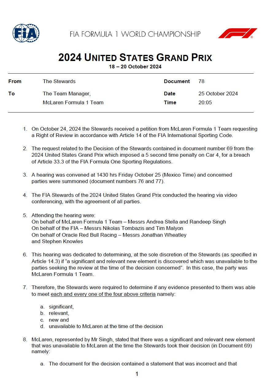 北京时间10月25日,国际汽联发布声明,确认迈凯伦针对上一站诺里斯被罚5秒提出的复审被驳回。美国站正赛最后阶段,诺里斯尝试超越维斯塔潘时四轮全部超出赛道白线,在赛道外获利完成超越并且没有及时交回位置。正赛结束前,FIA做出判罚,诺里斯因为此事被罚时5秒。最终,诺里斯也正是因为这5秒丢掉了颁奖台位置。赛后,迈凯伦收集证据称FIA关于诺里斯超车出白线瞬间还没有超过维斯塔潘的说法不对,相关文件中存在不正确的声明,赛会干事犯了可证明的错误。然而...